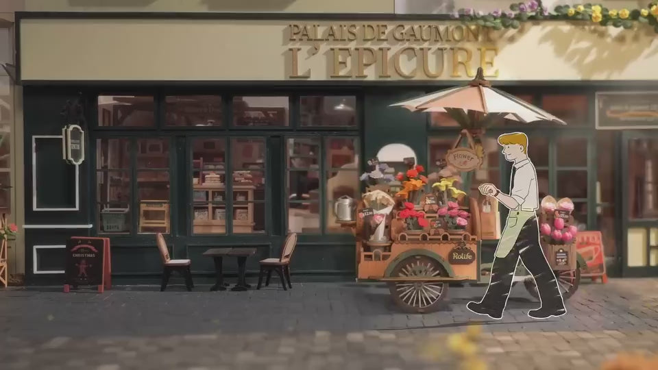 Flowers brighten anyone?€?s day, so pick up a bouquet for yourself or your loved one from the Blossom Cart. This 187-piece puzzle features a vintage-style wooden cart attached to a bicycle with spinning wheels to transport its haul to delighted passersby at the market. It has an umbrella to shield the buds from too much heat, and a watering can to keep the sprigs fresh. A blackboard is set up next to the cart to draw attention to the blooms, complemented by a small basket of bright yellow tulips. It seems you?€?ve attracted the curious nose of a cute kitty cat who now sits quietly by the cart, as well as a yellow butterfly that?€?s currently perched on your signage. From any angle you look at it, this cart is simply irresistible. any angle you look at it, this cart is simply irresistible. It?€?s great decor in places where people can get a 360?? view or as simply an addition to your other Rolife miniature houses and book nooks.